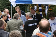 Die Arminia-Stadion-Hymne wurde extra umgetextet und dann hat die gesamte 1. Mannschaft gemeinsam mit Willy D’Villa für die Fans gesungen: „Arminia Arminia, ihr seid die besten Fans der Welt, auch unser Herz schlägt nur für dich, Arminia Bielefeld“.